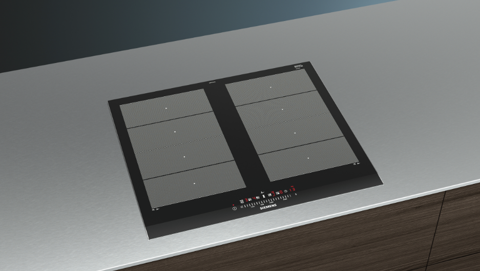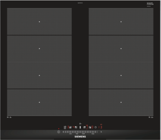 Indukčná varná doska SIEMENS EX 675FXC1E so 6 varnými zónami, 2 FlexiZone, funkciami reštart, QuickStart a powerManagement, zrýchlením powerBoost, minútkou, bezpečnostným vypínaním a detskou poistkou.
