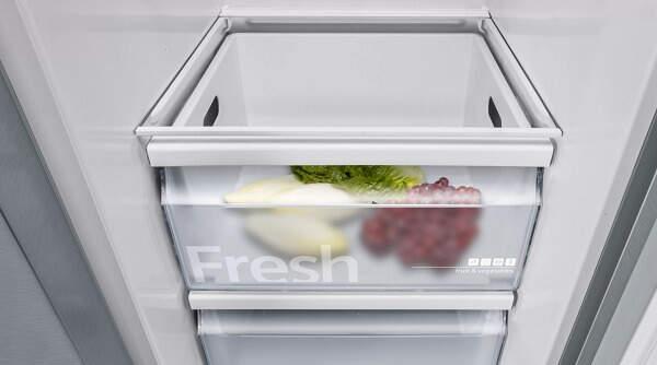 Vďaka technológii noFrost už nebudete musiet svoju inteligentnú chladničku pracne odmrazovať, čo vám ušetrí váš čas a zbaví zbytočnej námahy. Vďaka pokrokovému systému je chladný vzduch pomocou ventilátora rovnomerne prenášaný do každého kútu mraziaceho priestoru. Pri ventilácii sa potravinám odoberá vlhkosť a voda roztápajúca sa z námrazy sa vyparí mimo spotrebiča.