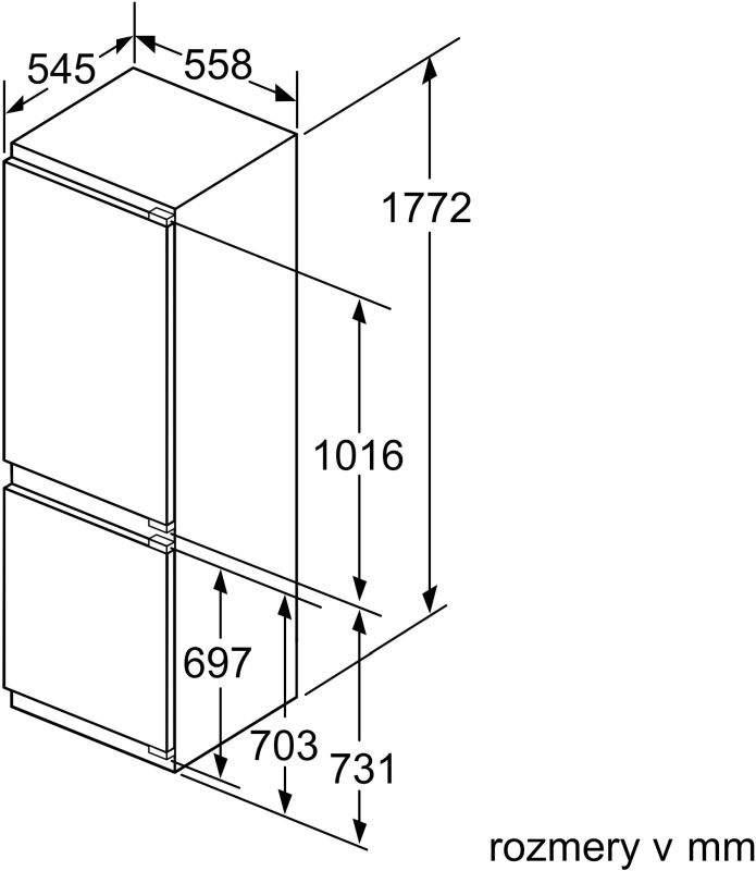 Siemens KI86NAD30. Dizajn skrine: vstavaný, Farba: biela, Uchytenie dverí: Vedľa seba. Celkový čistý objem: 257 L, Klimatická trieda: SN-ST, Úroveň hluku: 39 decibel. Čistá kapacita chladničky: 189 L, Typ lampy: LED. Umiestnenie mrazničky: spodné, Čistá kapacita mrazničky: 68 L, Mraziaci výkon: 8 kg/24h. Dĺžka kábla: 2,3 meter
