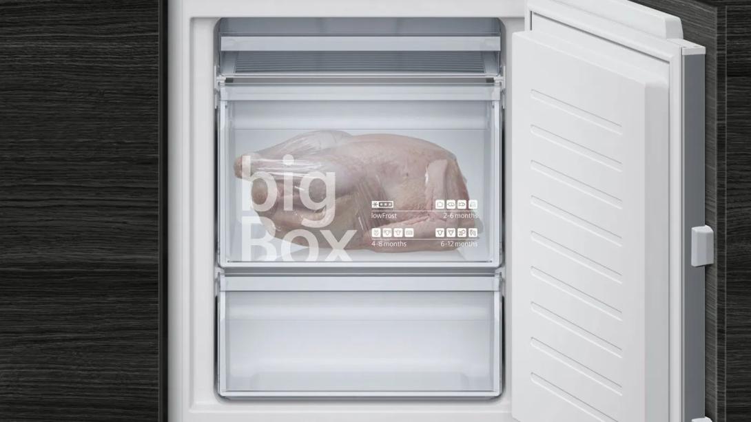 Mraznička je vybavená veľkou priehradkou bigBox, ktorá vám poskytne veľa miesta pre optimálne uskladnenie. Poslúži aj pre obzvlášť veľké a neskladné potraviny, ktoré potrebujú viacej priestoru. Jahňacie stehno, niekoľko krabíc pizze či veľká dóza na to všetko poslúži bigBox!