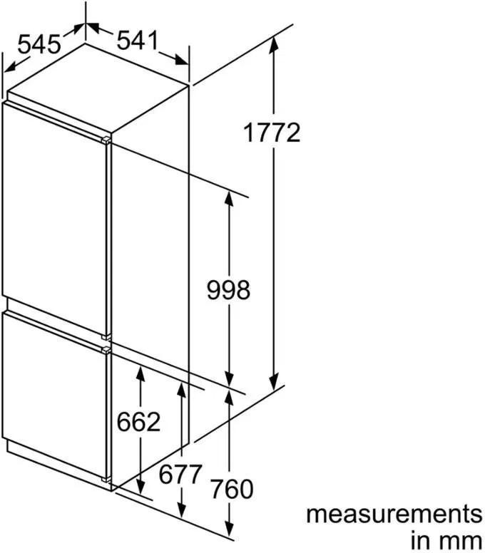 Vstavaná kombinovaná hladnička, Celkový čistý objem: 267 L, Ročná spotreba energie: 231 kWh, Maximálna hlučnosť: 38 dB