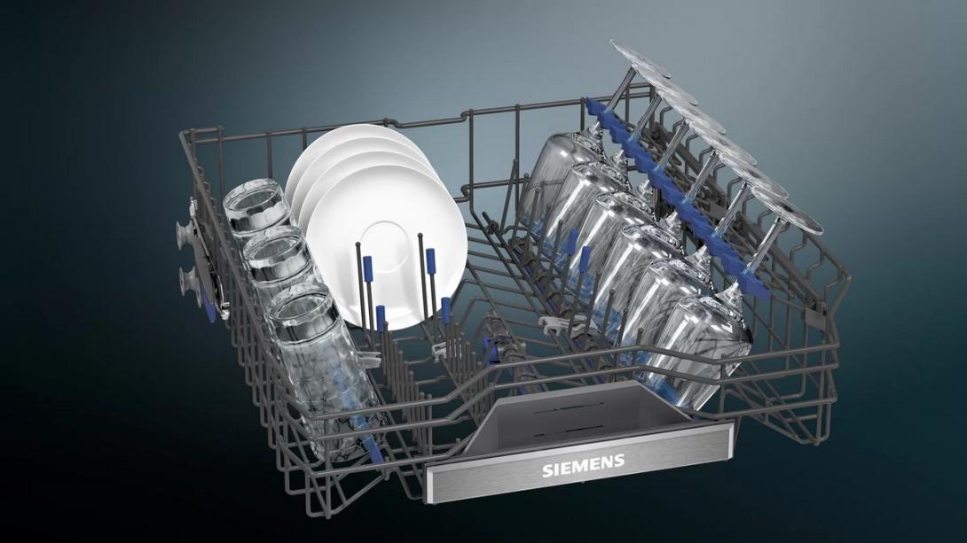 SN27YI03CEPrémiová konštrukcia umývačiek riadu Siemens nie je viditeľná iba zvonku. Modro označené uchopovacie časti vo vnútri umývačky vám na prvý pohľad ukazujú všetky možnosti nastavenia košov. Veľké hrnce tak môžu byť uložené rýchlejšie. Poháre na víno a šampanské sú výrazne stabilnejšie.