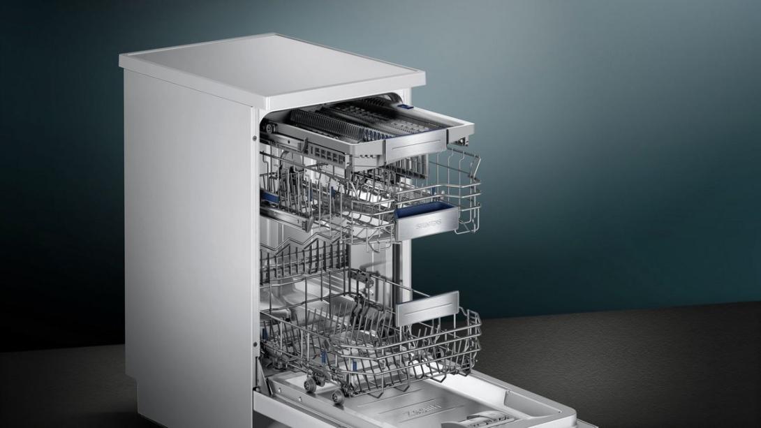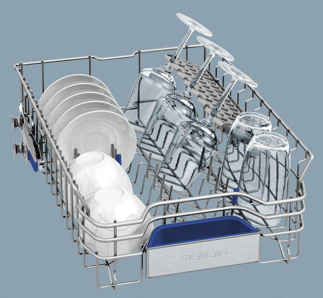Prémiová konštrukcia umývačiek riadu Siemens nie je viditeľná len zvonku. Modro označené uchopovacie časti vnútri umývačky vám na prvý pohľad ukazujú všetky možnosti nastavenia košov. Veľké hrnce tak môžu byť uložené rýchlejšie. Poháre na víno a šampanské sú výrazne stabilnejšie.