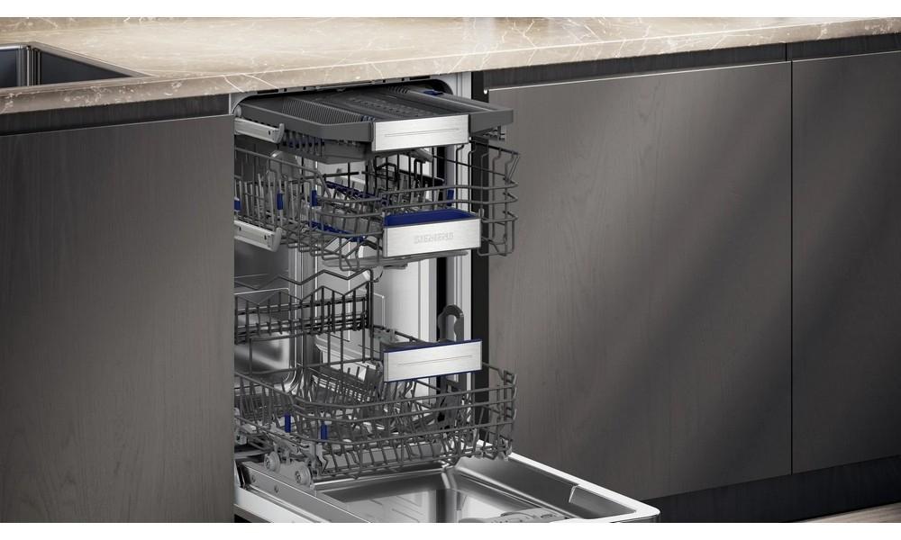 Systém rackMatic umožňuje jednoduchšie nakladanie a vykladanie riadu, najmä pri manipulácii s veľkými hrncami alebo tanieri. Výšku horného koša možno ľahko nastaviť v troch úrovniach pre vytvorenie viac či menej miesta, aj keď je umývačka naložená.