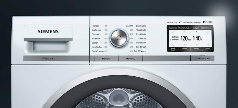 Sušička Siemens iQ800 WT48Y7W4 je prémiová kondenzačná sušička s tepelným čerpadlom iSensoric s najlepšou energetickou účinnosťou od značky Siemens. Absolútnym vrcholovým prvkom je automatický samočistiaci kondenzátor, ktorý meria dobu chodu a množstvo vody vyparenej z bielizne. V závislosti od týchto faktorov sa čistí úplne automaticky, dôkladne a niekoľkokrát po sebe počas cyklu sušenia. Zostáva tak bez nečistôt, odpadá nutnosť jeho manuálneho čistenia, je zachovaná nízka spotreba energie a vysoký výkon po dlhú životnosť prístroja.
