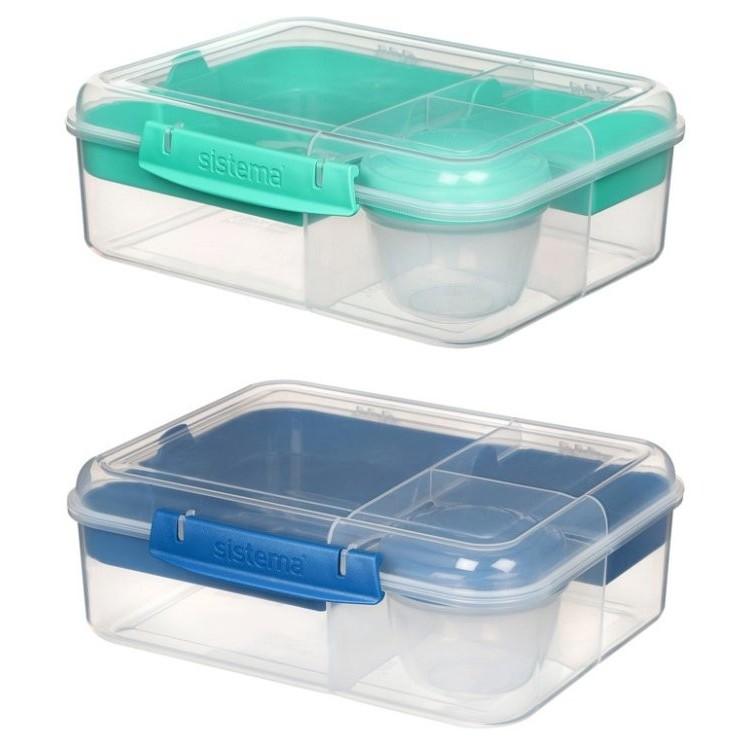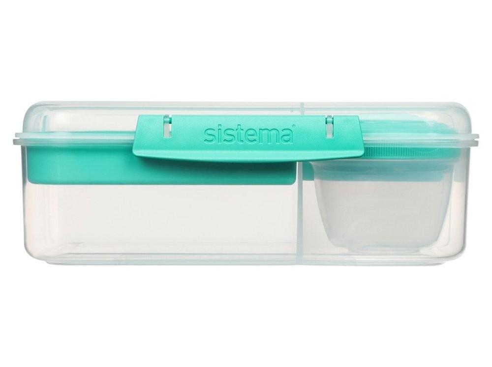 Sistema® TO GO™ Trojkomorová krabička s nádobou na jogurt a 2 tácky 1,65 l sa skladá z troch komôr, ktoré vám umožnia oddeliť rôzne druhy potravín.