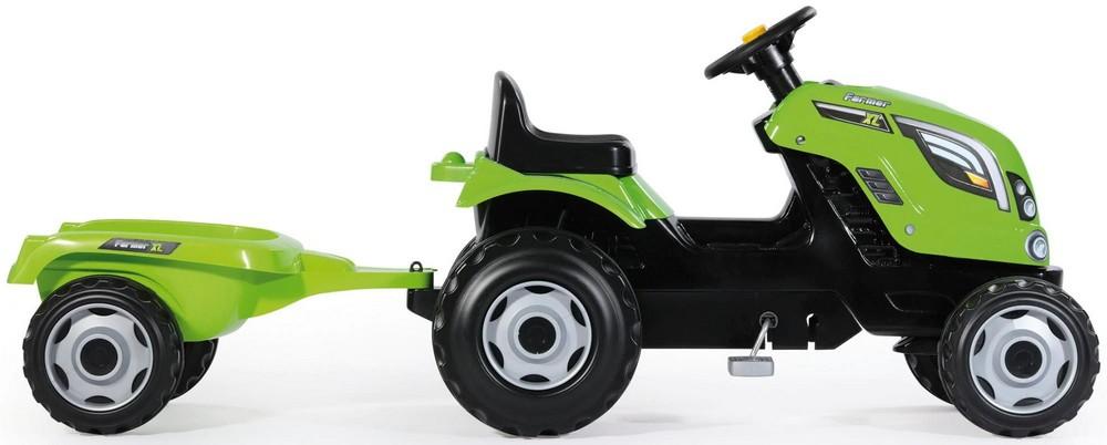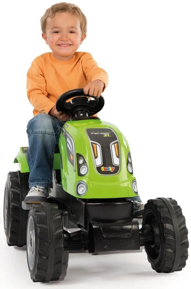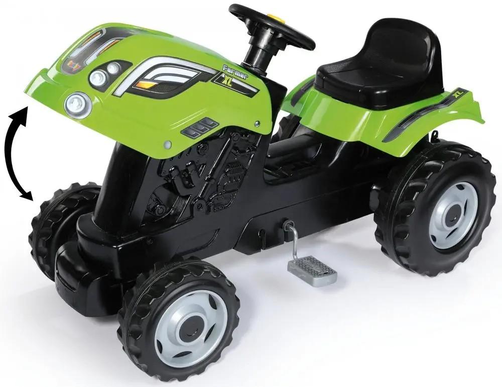 Šliapací traktor, Šliapací traktor s volantom a prívesným vozíkom, ktorý je možné odpojiť. Odklápací kryt motora.