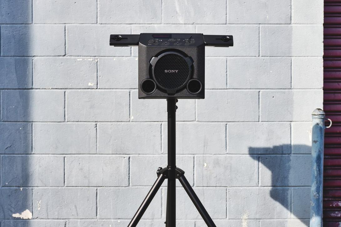 Vďaka vstavanému montážnemu otvoru sa môže zvukový systém GTK-PG10 umiestniť na reproduktorový statív, čím získa vyvýšenú pozíciu a zvuk sa tak môže šíriť medzi ľudí ešte efektívnejšie – či už sedia alebo stoja.