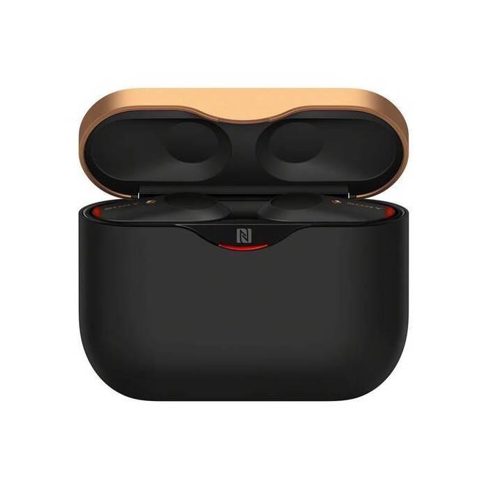 - Bezdrôtové (tzv. True wireless), uzavreté, dynamické slúchadlá do uší Sony s funkciou aktívneho potlačenia okolitého hluku (ANC), matná čierna farba so zlatými prvkami.