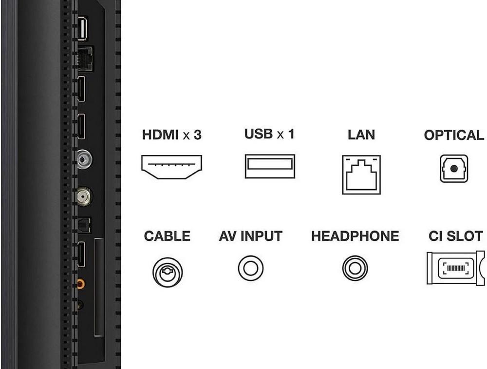 - Výstupy 2.0 USB, LAN, HDMI 2.1, Slúchadlový výstup, Digitálny optický/digitálny audio výstup, CI+, CI+ 1.4