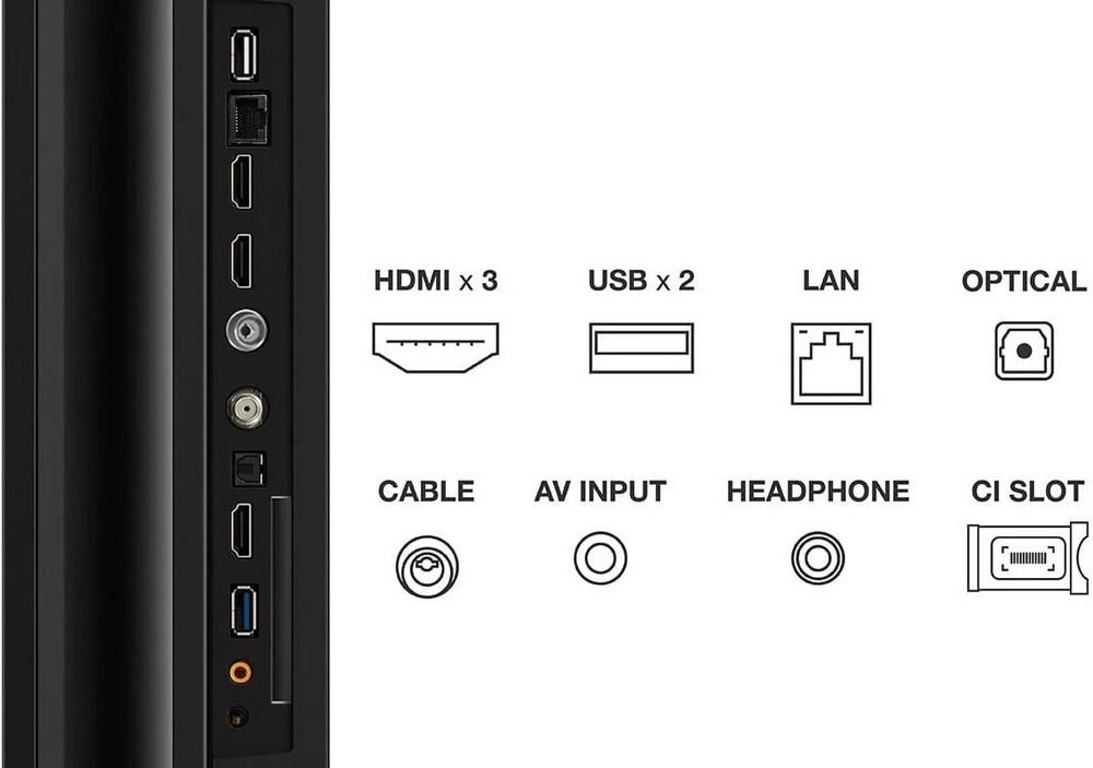 - Výstupy 2.0 USB, LAN, HDMI 2.1, Slúchadlový výstup, Digitálny optický/digitálny audio výstup, CI+, CI+ 1.4