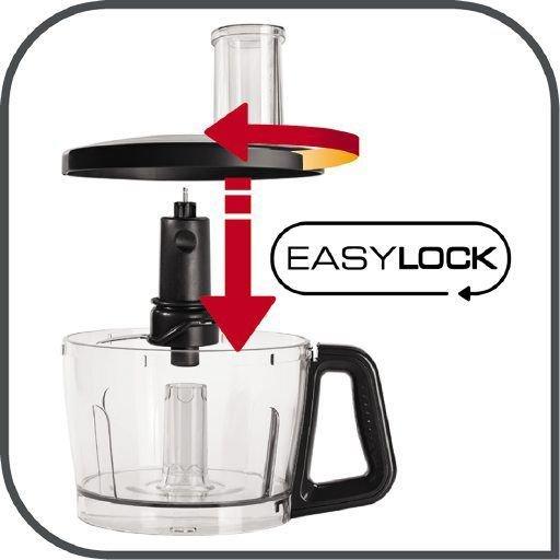 Zamykanie veka nikdy nebolo tak ľahké: ľubovoľne ich umiestnite na nádobu a len pootočíte o niekoľko stupňov v smere hodinových ručičiek, aby zámok správne zapadol. Sekaciu nádobu je možné na FOOD PROCESSOR zamykať aj v dvoch polohách, aby pohyb vyhovoval pravákom aj ľavákom.