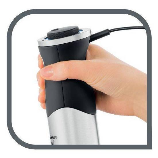 S tyčovým mixérom Quickchef značky Tefal si vychutnáte optimálny výkon s minimálnou námahou. Za chvíľku pripravíte najrôznejšie pokrmy vďaka vysoko výkonnému 1000 W motoru a prípravu budete mať pod absolútnou kontrolou vďaka 20 rýchlostiam, ktoré sa dajú nastavovať bez vypnutia mixéru intuitívnym a ľahko použiteľným voličom. Ochrana proti vystrieknutiu a nekĺzavá rukoväť ponúka komfortné použitie a jednotlivé diely sa dajú ľahko umývať v umývačke. Všetko dopĺňa odmerná nádoba s objemom 800 ml, sekáčik s 500 ml nádobou pre ľahké sekanie najrôznejších ingrediencií a metlička na bezpracné šľahanie.