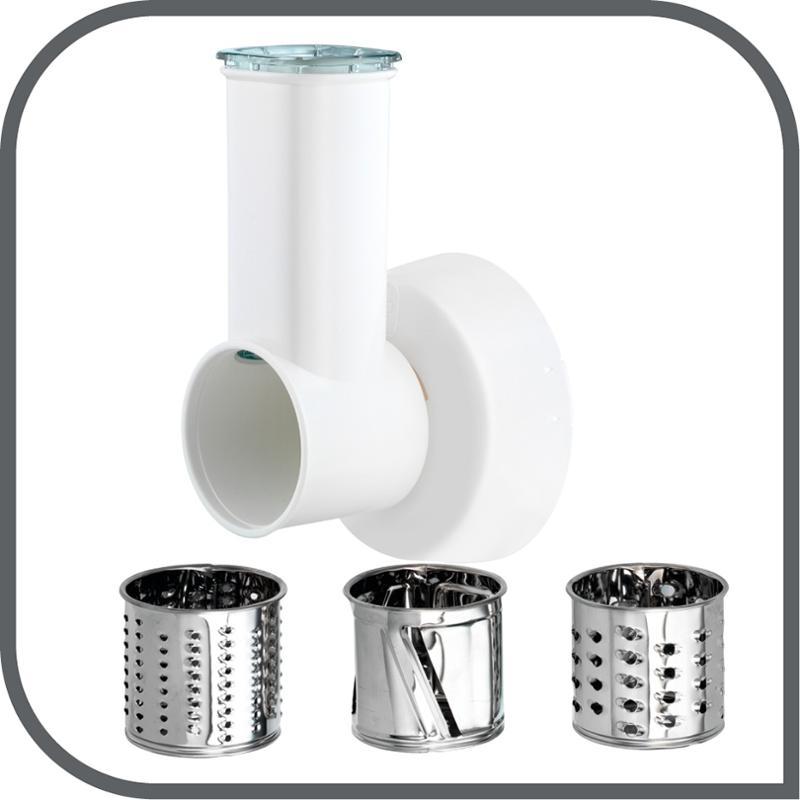 - Obsahuje strúhací nadstavec: Toto strúhadlo/krájač zahŕňa 3 odnímateľné antikorové valce, z ktorých suroviny putujú priamo do misy.