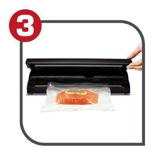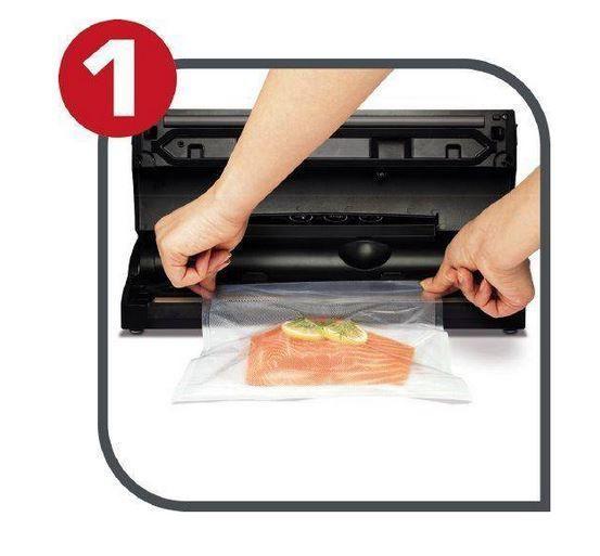 Tri jednoduché kroky, ako používať systém Vacupack Classic: naplňte vrecko a vložte ho otvorenou stranou do vákuovačky Vacupack Classic. Zatvorte veko a stlačte tlačidlo „Vacuum & Seal“. Otvorte veko a vyberte vákuovo zabalené potraviny. A môžete vyraziť!