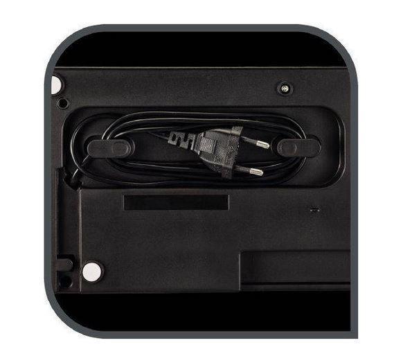 Úložný priestor na napájací kábel v zadnej časti a možnosť vertikálnej polohy na kuchynskej linke pre úsporu priestoru.