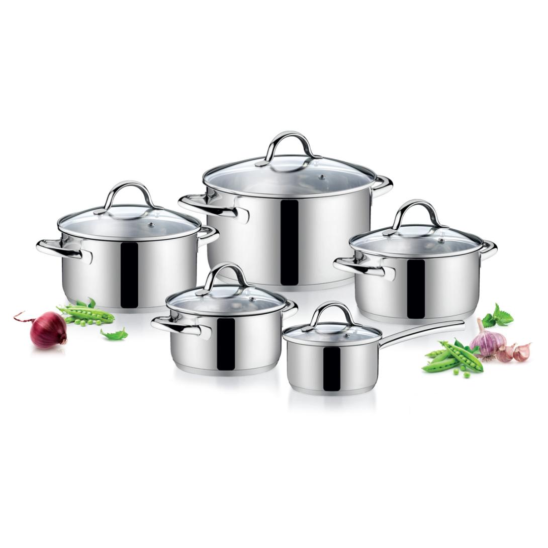 Kuchynský riad so sklonerezovými pokrievkami, masívnymi vodotesnými úchytkami, trojvrstvovým sendvičovým dnom a meracou stupnicou v každej nádobe. Vyrobený z prvotriednej nehrdzavejúcej ocele 18/10, vhodný pre všetky typy sporákov - plynové, elektrické, sklokeramické a indukčné, vhodný do umývačky.