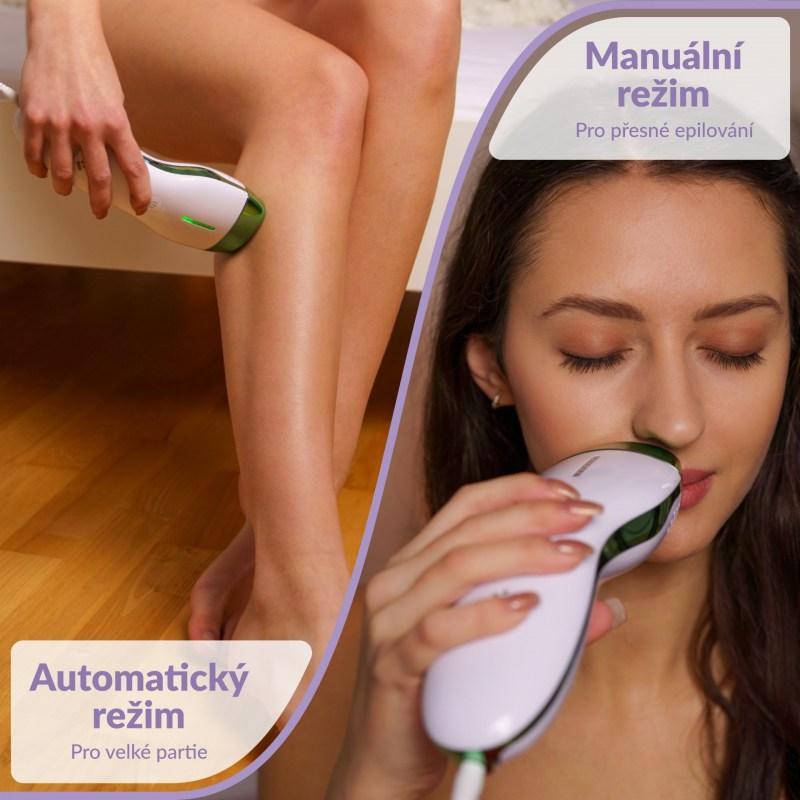 Epilátor TrueLife BELLE IPL E3 ponúka dva režimy. Manuálny režim jednotlivých zábleskov je vhodný k epilácii malých a ťažko dostupných oblastí, ako sú tvár, podpazušie, oblasť bikín alebo členky. S automatickým režimom rýchlo a pohodlne ošetríte väčšie oblasti, napríklad nohy. Akonáhle sa prístroj dotkne epilovanej oblasti, jednoducho podržíte tlačidlo ovládania po dobu 3 sekúnd, epilátor sa prepne do automatického režimu, kedy pri plynulom pohybe po pokožke bude neustále vydávať záblesky.