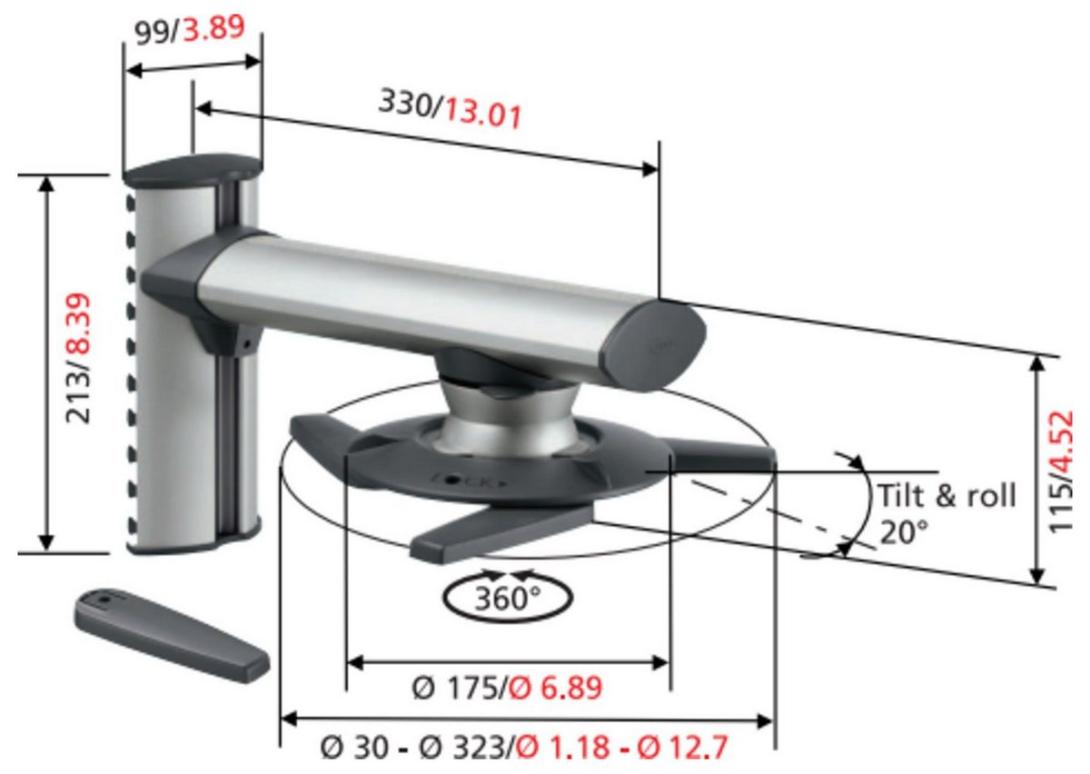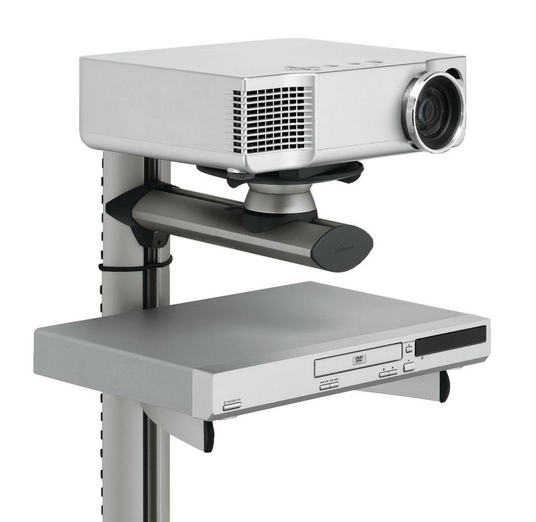 Nástenný držiak na menší projektor Univerzálny držiak umožní bezpečne namontovať na stenu ľubovolný menší projektor do 10 kg. Projektor môžeme namontovať štandartne, aleboo hore nohami v ľubovoľnej výške. Vďaka nastavitelnému ramenu môžeme meniť vzdialenosť uchytenia od steny, vyhovuje teda projektorom rôzných veľkostí. Unikátny guľový kĺb poskytuje široký rozsah jednoduchého nastavenia požadovaného smeru, to je vďaka následnej aretácii veľmi stabilné. Ak projektor nepoužívame, môžeme ho spolu s vodorovným ramenom jednoducho bez použitia náradia zložiť.
