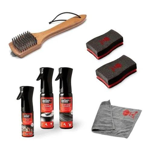 Sada obsahuje: čistiacu kefu na gril, sprej na čistenie grilovacích roštov, sprej na čistenie smaltovaných povrchov, Anti-Stick sprej na premazanie roštov, 2 hubky, handričku.